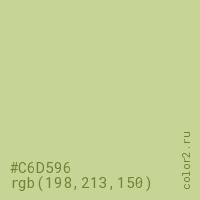 Цвет #C6D596 в цветовой модели RGB обозначается тремя октетами (198, 213, 150) в десятичном формате и #C6D596 в шестнадцатиричном (hex) формате, которые являются интенсивностью красного 198 (hex C6), интенсивность зелёного 213 (hex D5) и интенсивность синего 150 (hex 96).