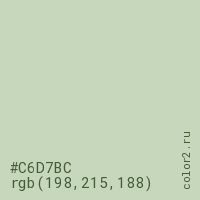Цвет #C6D7BC в цветовой модели RGB обозначается тремя октетами (198, 215, 188) в десятичном формате и #C6D7BC в шестнадцатиричном (hex) формате, которые являются интенсивностью красного 198 (hex C6), интенсивность зелёного 215 (hex D7) и интенсивность синего 188 (hex BC).