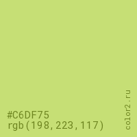 Цвет #C6DF75 в цветовой модели RGB обозначается тремя октетами (198, 223, 117) в десятичном формате и #C6DF75 в шестнадцатиричном (hex) формате, которые являются интенсивностью красного 198 (hex C6), интенсивность зелёного 223 (hex DF) и интенсивность синего 117 (hex 75).