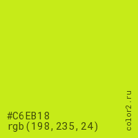 Цвет #C6EB18 в цветовой модели RGB обозначается тремя октетами (198, 235, 24) в десятичном формате и #C6EB18 в шестнадцатиричном (hex) формате, которые являются интенсивностью красного 198 (hex C6), интенсивность зелёного 235 (hex EB) и интенсивность синего 24 (hex 18).