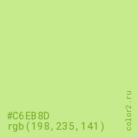 Цвет #C6EB8D в цветовой модели RGB обозначается тремя октетами (198, 235, 141) в десятичном формате и #C6EB8D в шестнадцатиричном (hex) формате, которые являются интенсивностью красного 198 (hex C6), интенсивность зелёного 235 (hex EB) и интенсивность синего 141 (hex 8D).