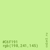 Цвет #C6F191 в цветовой модели RGB обозначается тремя октетами (198, 241, 145) в десятичном формате и #C6F191 в шестнадцатиричном (hex) формате, которые являются интенсивностью красного 198 (hex C6), интенсивность зелёного 241 (hex F1) и интенсивность синего 145 (hex 91).