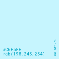 Цвет #C6F5FE в цветовой модели RGB обозначается тремя октетами (198, 245, 254) в десятичном формате и #C6F5FE в шестнадцатиричном (hex) формате, которые являются интенсивностью красного 198 (hex C6), интенсивность зелёного 245 (hex F5) и интенсивность синего 254 (hex FE).