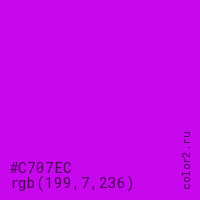 Цвет #C707EC в цветовой модели RGB обозначается тремя октетами (199, 7, 236) в десятичном формате и #C707EC в шестнадцатиричном (hex) формате, которые являются интенсивностью красного 199 (hex C7), интенсивность зелёного 7 (hex 07) и интенсивность синего 236 (hex EC).