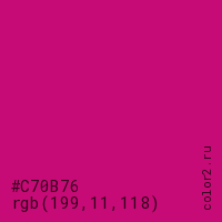 Цвет #C70B76 в цветовой модели RGB обозначается тремя октетами (199, 11, 118) в десятичном формате и #C70B76 в шестнадцатиричном (hex) формате, которые являются интенсивностью красного 199 (hex C7), интенсивность зелёного 11 (hex 0B) и интенсивность синего 118 (hex 76).