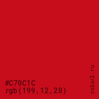 Цвет #C70C1C в цветовой модели RGB обозначается тремя октетами (199, 12, 28) в десятичном формате и #C70C1C в шестнадцатиричном (hex) формате, которые являются интенсивностью красного 199 (hex C7), интенсивность зелёного 12 (hex 0C) и интенсивность синего 28 (hex 1C).