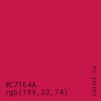 Цвет #C7164A в цветовой модели RGB обозначается тремя октетами (199, 22, 74) в десятичном формате и #C7164A в шестнадцатиричном (hex) формате, которые являются интенсивностью красного 199 (hex C7), интенсивность зелёного 22 (hex 16) и интенсивность синего 74 (hex 4A).
