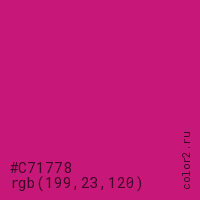 Цвет #C71778 в цветовой модели RGB обозначается тремя октетами (199, 23, 120) в десятичном формате и #C71778 в шестнадцатиричном (hex) формате, которые являются интенсивностью красного 199 (hex C7), интенсивность зелёного 23 (hex 17) и интенсивность синего 120 (hex 78).