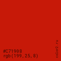Цвет #C71908 в цветовой модели RGB обозначается тремя октетами (199, 25, 8) в десятичном формате и #C71908 в шестнадцатиричном (hex) формате, которые являются интенсивностью красного 199 (hex C7), интенсивность зелёного 25 (hex 19) и интенсивность синего 8 (hex 08).