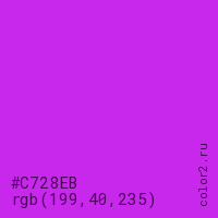 Цвет #C728EB в цветовой модели RGB обозначается тремя октетами (199, 40, 235) в десятичном формате и #C728EB в шестнадцатиричном (hex) формате, которые являются интенсивностью красного 199 (hex C7), интенсивность зелёного 40 (hex 28) и интенсивность синего 235 (hex EB).