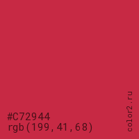 Цвет #C72944 в цветовой модели RGB обозначается тремя октетами (199, 41, 68) в десятичном формате и #C72944 в шестнадцатиричном (hex) формате, которые являются интенсивностью красного 199 (hex C7), интенсивность зелёного 41 (hex 29) и интенсивность синего 68 (hex 44).