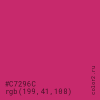 Цвет #C7296C в цветовой модели RGB обозначается тремя октетами (199, 41, 108) в десятичном формате и #C7296C в шестнадцатиричном (hex) формате, которые являются интенсивностью красного 199 (hex C7), интенсивность зелёного 41 (hex 29) и интенсивность синего 108 (hex 6C).