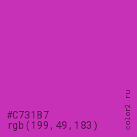 Цвет #C731B7 в цветовой модели RGB обозначается тремя октетами (199, 49, 183) в десятичном формате и #C731B7 в шестнадцатиричном (hex) формате, которые являются интенсивностью красного 199 (hex C7), интенсивность зелёного 49 (hex 31) и интенсивность синего 183 (hex B7).