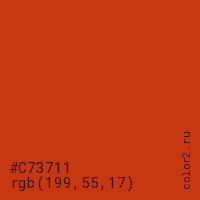 Цвет #C73711 в цветовой модели RGB обозначается тремя октетами (199, 55, 17) в десятичном формате и #C73711 в шестнадцатиричном (hex) формате, которые являются интенсивностью красного 199 (hex C7), интенсивность зелёного 55 (hex 37) и интенсивность синего 17 (hex 11).