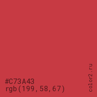 Цвет #C73A43 в цветовой модели RGB обозначается тремя октетами (199, 58, 67) в десятичном формате и #C73A43 в шестнадцатиричном (hex) формате, которые являются интенсивностью красного 199 (hex C7), интенсивность зелёного 58 (hex 3A) и интенсивность синего 67 (hex 43).
