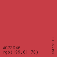 Цвет #C73D46 в цветовой модели RGB обозначается тремя октетами (199, 61, 70) в десятичном формате и #C73D46 в шестнадцатиричном (hex) формате, которые являются интенсивностью красного 199 (hex C7), интенсивность зелёного 61 (hex 3D) и интенсивность синего 70 (hex 46).