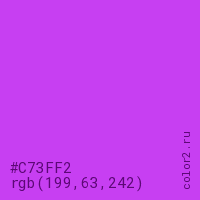Цвет #C73FF2 в цветовой модели RGB обозначается тремя октетами (199, 63, 242) в десятичном формате и #C73FF2 в шестнадцатиричном (hex) формате, которые являются интенсивностью красного 199 (hex C7), интенсивность зелёного 63 (hex 3F) и интенсивность синего 242 (hex F2).