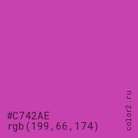Цвет #C742AE в цветовой модели RGB обозначается тремя октетами (199, 66, 174) в десятичном формате и #C742AE в шестнадцатиричном (hex) формате, которые являются интенсивностью красного 199 (hex C7), интенсивность зелёного 66 (hex 42) и интенсивность синего 174 (hex AE).
