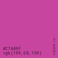Цвет #C7449F в цветовой модели RGB обозначается тремя октетами (199, 68, 159) в десятичном формате и #C7449F в шестнадцатиричном (hex) формате, которые являются интенсивностью красного 199 (hex C7), интенсивность зелёного 68 (hex 44) и интенсивность синего 159 (hex 9F).