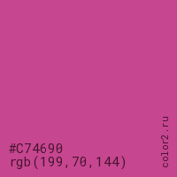 Цвет #C74690 в цветовой модели RGB обозначается тремя октетами (199, 70, 144) в десятичном формате и #C74690 в шестнадцатиричном (hex) формате, которые являются интенсивностью красного 199 (hex C7), интенсивность зелёного 70 (hex 46) и интенсивность синего 144 (hex 90).