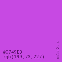 Цвет #C749E3 в цветовой модели RGB обозначается тремя октетами (199, 73, 227) в десятичном формате и #C749E3 в шестнадцатиричном (hex) формате, которые являются интенсивностью красного 199 (hex C7), интенсивность зелёного 73 (hex 49) и интенсивность синего 227 (hex E3).
