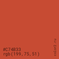 Цвет #C74B33 в цветовой модели RGB обозначается тремя октетами (199, 75, 51) в десятичном формате и #C74B33 в шестнадцатиричном (hex) формате, которые являются интенсивностью красного 199 (hex C7), интенсивность зелёного 75 (hex 4B) и интенсивность синего 51 (hex 33).