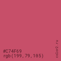 Цвет #C74F69 в цветовой модели RGB обозначается тремя октетами (199, 79, 105) в десятичном формате и #C74F69 в шестнадцатиричном (hex) формате, которые являются интенсивностью красного 199 (hex C7), интенсивность зелёного 79 (hex 4F) и интенсивность синего 105 (hex 69).