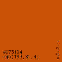 Цвет #C75104 в цветовой модели RGB обозначается тремя октетами (199, 81, 4) в десятичном формате и #C75104 в шестнадцатиричном (hex) формате, которые являются интенсивностью красного 199 (hex C7), интенсивность зелёного 81 (hex 51) и интенсивность синего 4 (hex 04).