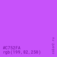 Цвет #C752FA в цветовой модели RGB обозначается тремя октетами (199, 82, 250) в десятичном формате и #C752FA в шестнадцатиричном (hex) формате, которые являются интенсивностью красного 199 (hex C7), интенсивность зелёного 82 (hex 52) и интенсивность синего 250 (hex FA).