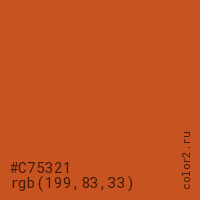 Цвет #C75321 в цветовой модели RGB обозначается тремя октетами (199, 83, 33) в десятичном формате и #C75321 в шестнадцатиричном (hex) формате, которые являются интенсивностью красного 199 (hex C7), интенсивность зелёного 83 (hex 53) и интенсивность синего 33 (hex 21).