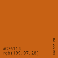 Цвет #C76114 в цветовой модели RGB обозначается тремя октетами (199, 97, 20) в десятичном формате и #C76114 в шестнадцатиричном (hex) формате, которые являются интенсивностью красного 199 (hex C7), интенсивность зелёного 97 (hex 61) и интенсивность синего 20 (hex 14).