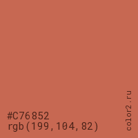 Цвет #C76852 в цветовой модели RGB обозначается тремя октетами (199, 104, 82) в десятичном формате и #C76852 в шестнадцатиричном (hex) формате, которые являются интенсивностью красного 199 (hex C7), интенсивность зелёного 104 (hex 68) и интенсивность синего 82 (hex 52).