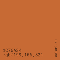 Цвет #C76A34 в цветовой модели RGB обозначается тремя октетами (199, 106, 52) в десятичном формате и #C76A34 в шестнадцатиричном (hex) формате, которые являются интенсивностью красного 199 (hex C7), интенсивность зелёного 106 (hex 6A) и интенсивность синего 52 (hex 34).