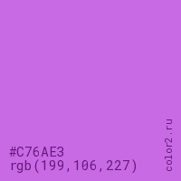 Цвет #C76AE3 в цветовой модели RGB обозначается тремя октетами (199, 106, 227) в десятичном формате и #C76AE3 в шестнадцатиричном (hex) формате, которые являются интенсивностью красного 199 (hex C7), интенсивность зелёного 106 (hex 6A) и интенсивность синего 227 (hex E3).