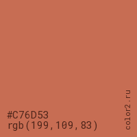 Цвет #C76D53 в цветовой модели RGB обозначается тремя октетами (199, 109, 83) в десятичном формате и #C76D53 в шестнадцатиричном (hex) формате, которые являются интенсивностью красного 199 (hex C7), интенсивность зелёного 109 (hex 6D) и интенсивность синего 83 (hex 53).