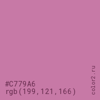 Цвет #C779A6 в цветовой модели RGB обозначается тремя октетами (199, 121, 166) в десятичном формате и #C779A6 в шестнадцатиричном (hex) формате, которые являются интенсивностью красного 199 (hex C7), интенсивность зелёного 121 (hex 79) и интенсивность синего 166 (hex A6).