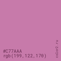 Цвет #C77AAA в цветовой модели RGB обозначается тремя октетами (199, 122, 170) в десятичном формате и #C77AAA в шестнадцатиричном (hex) формате, которые являются интенсивностью красного 199 (hex C7), интенсивность зелёного 122 (hex 7A) и интенсивность синего 170 (hex AA).
