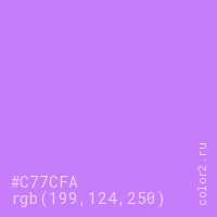 Цвет RGB(199, 124, 250) в процентом отношении количества цвета состоит из 78% красного (red), 48.6% зелёного (green) и 98% синего (blue).