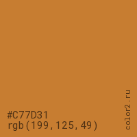 Цвет #C77D31 в цветовой модели RGB обозначается тремя октетами (199, 125, 49) в десятичном формате и #C77D31 в шестнадцатиричном (hex) формате, которые являются интенсивностью красного 199 (hex C7), интенсивность зелёного 125 (hex 7D) и интенсивность синего 49 (hex 31).