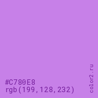 Цвет #C780E8 в цветовой модели RGB обозначается тремя октетами (199, 128, 232) в десятичном формате и #C780E8 в шестнадцатиричном (hex) формате, которые являются интенсивностью красного 199 (hex C7), интенсивность зелёного 128 (hex 80) и интенсивность синего 232 (hex E8).