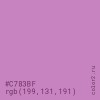 Цвет #C783BF в цветовой модели RGB обозначается тремя октетами (199, 131, 191) в десятичном формате и #C783BF в шестнадцатиричном (hex) формате, которые являются интенсивностью красного 199 (hex C7), интенсивность зелёного 131 (hex 83) и интенсивность синего 191 (hex BF).