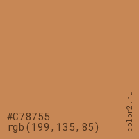 Цвет #C78755 в цветовой модели RGB обозначается тремя октетами (199, 135, 85) в десятичном формате и #C78755 в шестнадцатиричном (hex) формате, которые являются интенсивностью красного 199 (hex C7), интенсивность зелёного 135 (hex 87) и интенсивность синего 85 (hex 55).