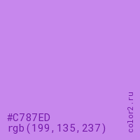 Цвет #C787ED в цветовой модели RGB обозначается тремя октетами (199, 135, 237) в десятичном формате и #C787ED в шестнадцатиричном (hex) формате, которые являются интенсивностью красного 199 (hex C7), интенсивность зелёного 135 (hex 87) и интенсивность синего 237 (hex ED).