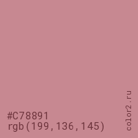 Цвет #C78891 в цветовой модели RGB обозначается тремя октетами (199, 136, 145) в десятичном формате и #C78891 в шестнадцатиричном (hex) формате, которые являются интенсивностью красного 199 (hex C7), интенсивность зелёного 136 (hex 88) и интенсивность синего 145 (hex 91).