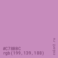 Цвет #C78BBC в цветовой модели RGB обозначается тремя октетами (199, 139, 188) в десятичном формате и #C78BBC в шестнадцатиричном (hex) формате, которые являются интенсивностью красного 199 (hex C7), интенсивность зелёного 139 (hex 8B) и интенсивность синего 188 (hex BC).
