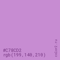Цвет #C78CD2 в цветовой модели RGB обозначается тремя октетами (199, 140, 210) в десятичном формате и #C78CD2 в шестнадцатиричном (hex) формате, которые являются интенсивностью красного 199 (hex C7), интенсивность зелёного 140 (hex 8C) и интенсивность синего 210 (hex D2).
