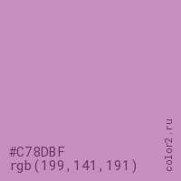 Цвет #C78DBF в цветовой модели RGB обозначается тремя октетами (199, 141, 191) в десятичном формате и #C78DBF в шестнадцатиричном (hex) формате, которые являются интенсивностью красного 199 (hex C7), интенсивность зелёного 141 (hex 8D) и интенсивность синего 191 (hex BF).