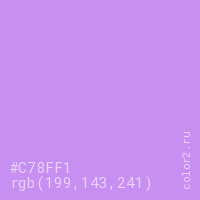 Цвет #C78FF1 в цветовой модели RGB обозначается тремя октетами (199, 143, 241) в десятичном формате и #C78FF1 в шестнадцатиричном (hex) формате, которые являются интенсивностью красного 199 (hex C7), интенсивность зелёного 143 (hex 8F) и интенсивность синего 241 (hex F1).