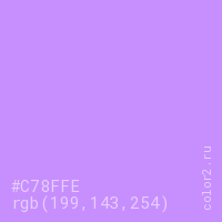 Цвет #C78FFE в цветовой модели RGB обозначается тремя октетами (199, 143, 254) в десятичном формате и #C78FFE в шестнадцатиричном (hex) формате, которые являются интенсивностью красного 199 (hex C7), интенсивность зелёного 143 (hex 8F) и интенсивность синего 254 (hex FE).