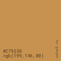 Цвет #C79250 в цветовой модели RGB обозначается тремя октетами (199, 146, 80) в десятичном формате и #C79250 в шестнадцатиричном (hex) формате, которые являются интенсивностью красного 199 (hex C7), интенсивность зелёного 146 (hex 92) и интенсивность синего 80 (hex 50).